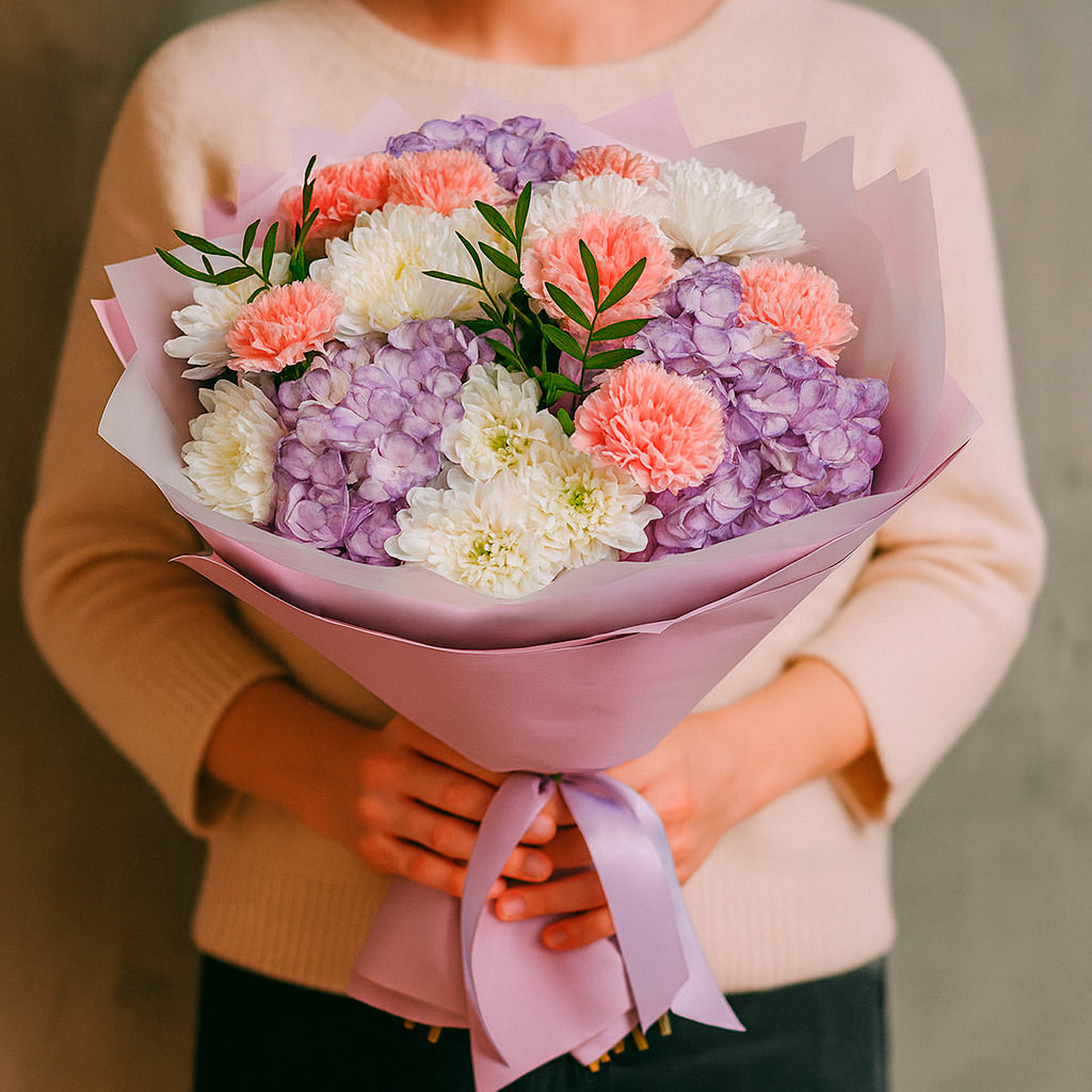 Фиолетовая гортензия, розовая гвоздика и белая кустовая хризантема создают нежный и гармоничный ансамбль. Букет перевязан атласной лентой и оформлен в матовую плёнку, что подчёркивает его элегантность. Возможны альтернативы упаковки: крафт-бумага или декоративная сетка. Прекрасный выбор для подарка на день рождения для любимой.