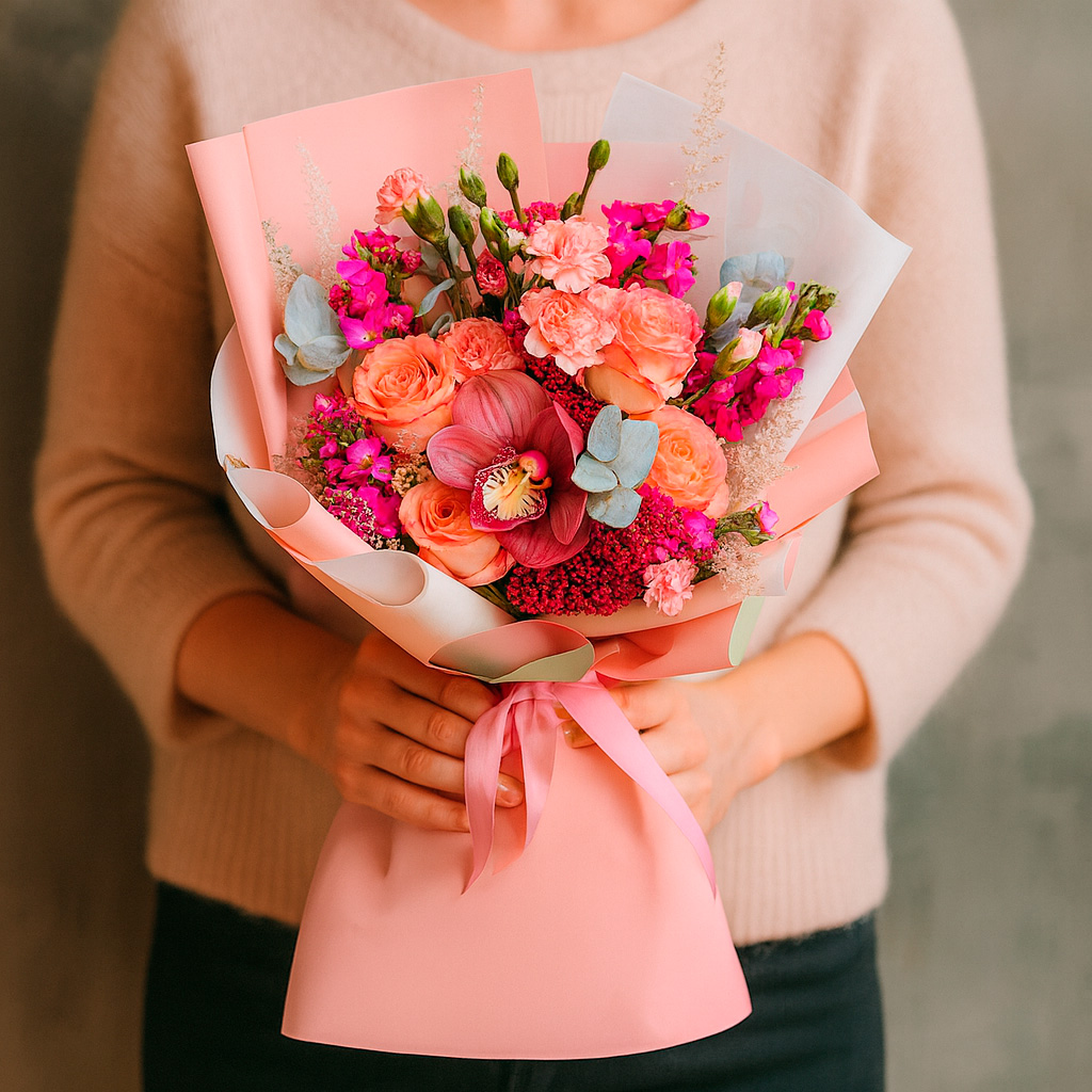 Розовые орхидеи, нежные розы и кустовые гвоздики создают гармоничную композицию с сиреневой маттиолой и эвкалиптом. Упакован в матовую плёнку пастельных тонов с розовой лентой. Альтернативные варианты упаковки: атласная лента или крафт-бумага. Прекрасный подарок для любимой на день рождения.