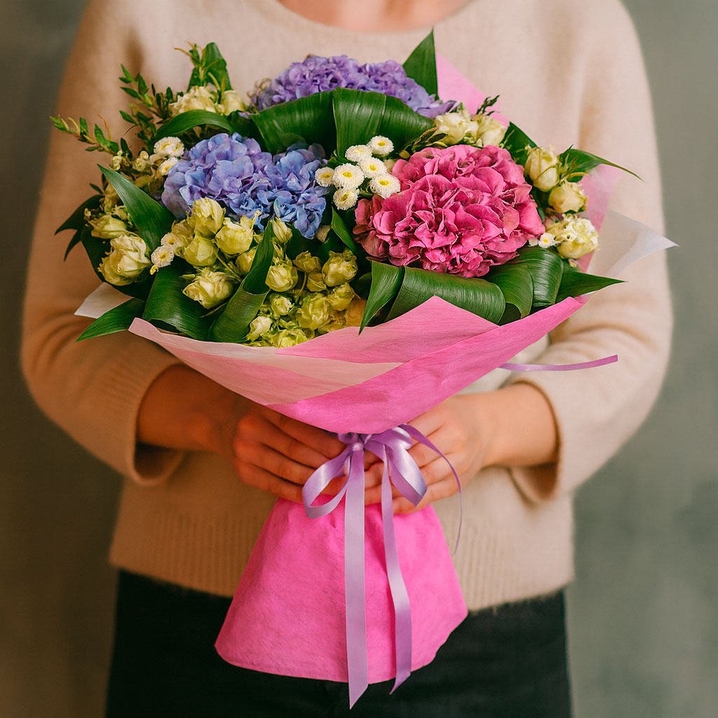 Роскошный букет сочетает в себе розовую и фиолетовую гортензии, белые кустовые розы и миниатюрные маргаритки, дополненные фисташкой и аспидистрой. Упакован в яркую розовую матовую плёнку и перевязан атласной лентой. Возможны альтернативы оформления с использованием крафт-бумаги или декоративной сетки. Прекрасный выбор для подарка на день рождения для любимой.