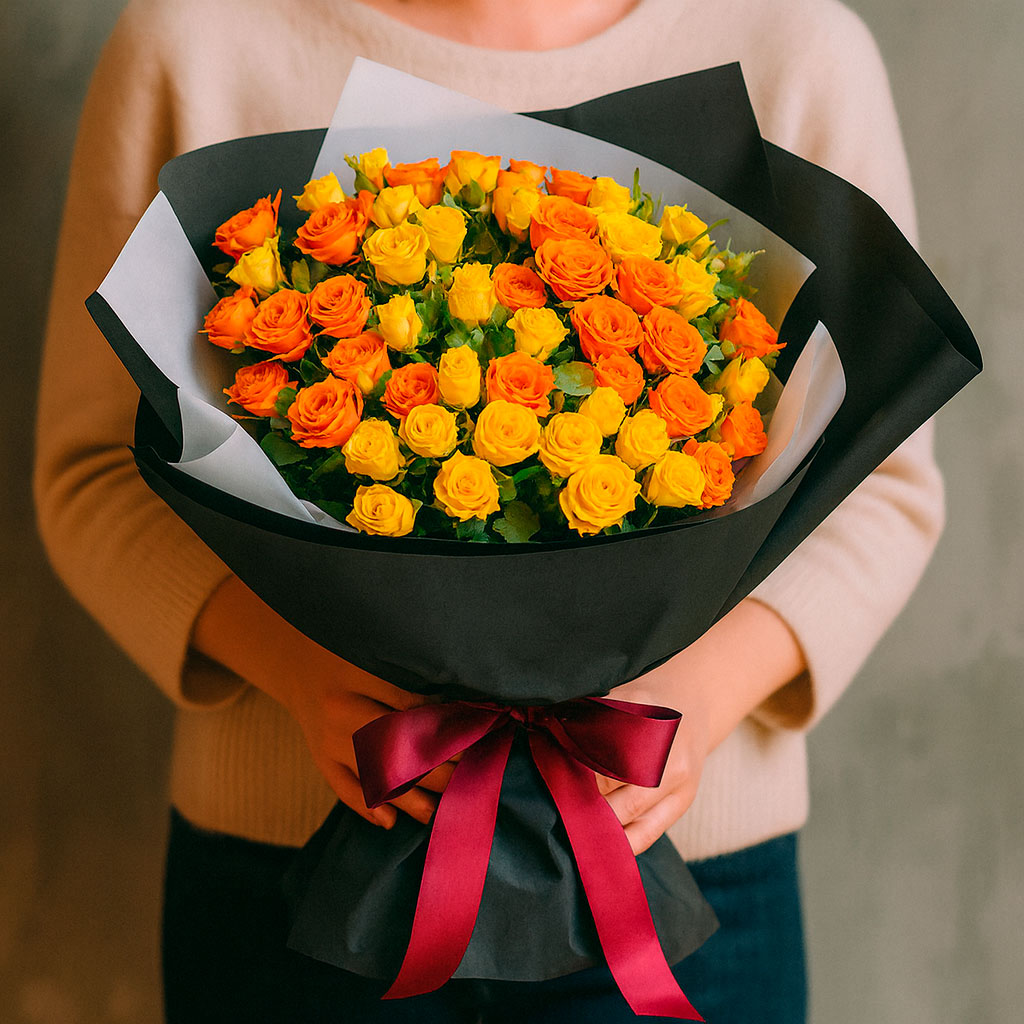 Яркие кустовые розы в жёлтых и оранжевых тонах создают атмосферу солнечного праздника. Букет оформлен в матовую чёрную плёнку и перевязан бордовой лентой. Возможны альтернативы упаковки: крафт-бумага или декоративная сетка. Прекрасный подарок для жены на годовщину или для мамы на день рождения.