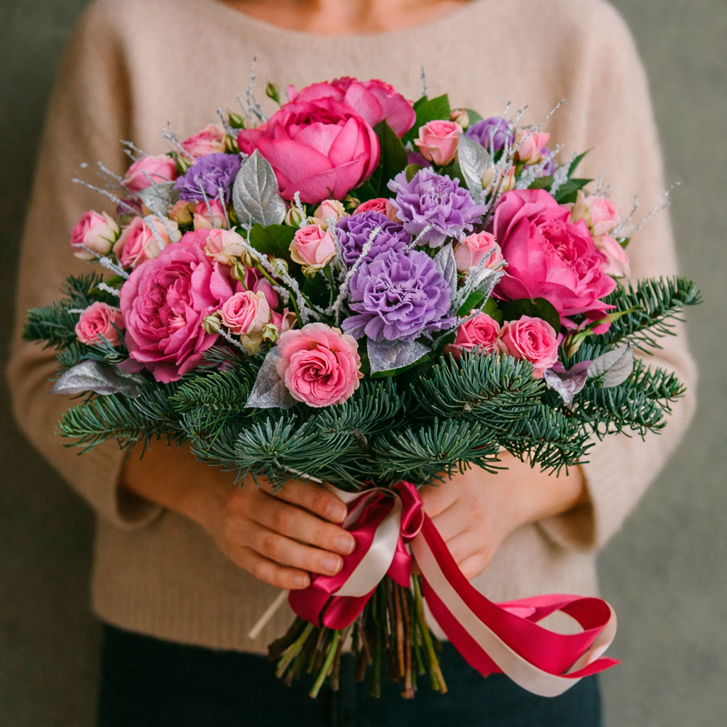 Роскошное сочетание розовых одноголовых и кустовых роз с сиреневыми гвоздиками и пихтой создаёт атмосферу зимней сказки. Букет перевязан яркой атласной лентой, добавляя изысканности. Возможны варианты оформления с матовой плёнкой или крафт-бумагой. Прекрасный выбор для подарка на Новый год для любимой.