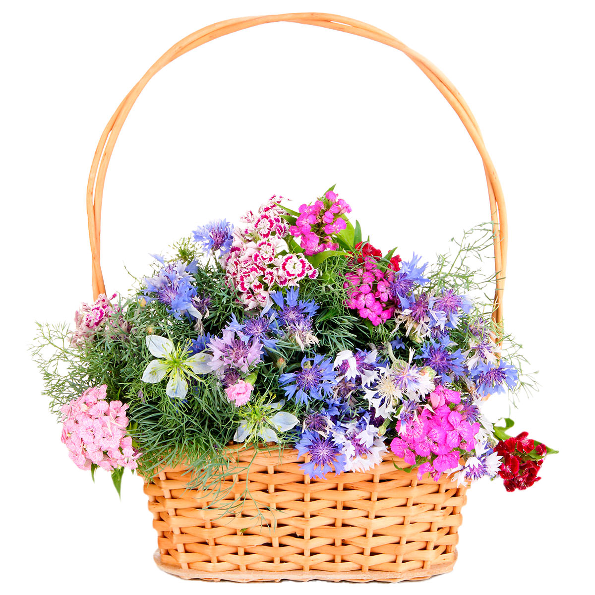 Плетёная корзина наполнена яркими цветами: гвоздика турецкая, василек и нигелла создают гармоничную композицию. Плетёная корзина придаёт естественность и лёгкость. Возможны альтернативы оформления: корзина из лозы или корзина из ротанга. Прекрасный подарок на день рождения для мамы или подруги.