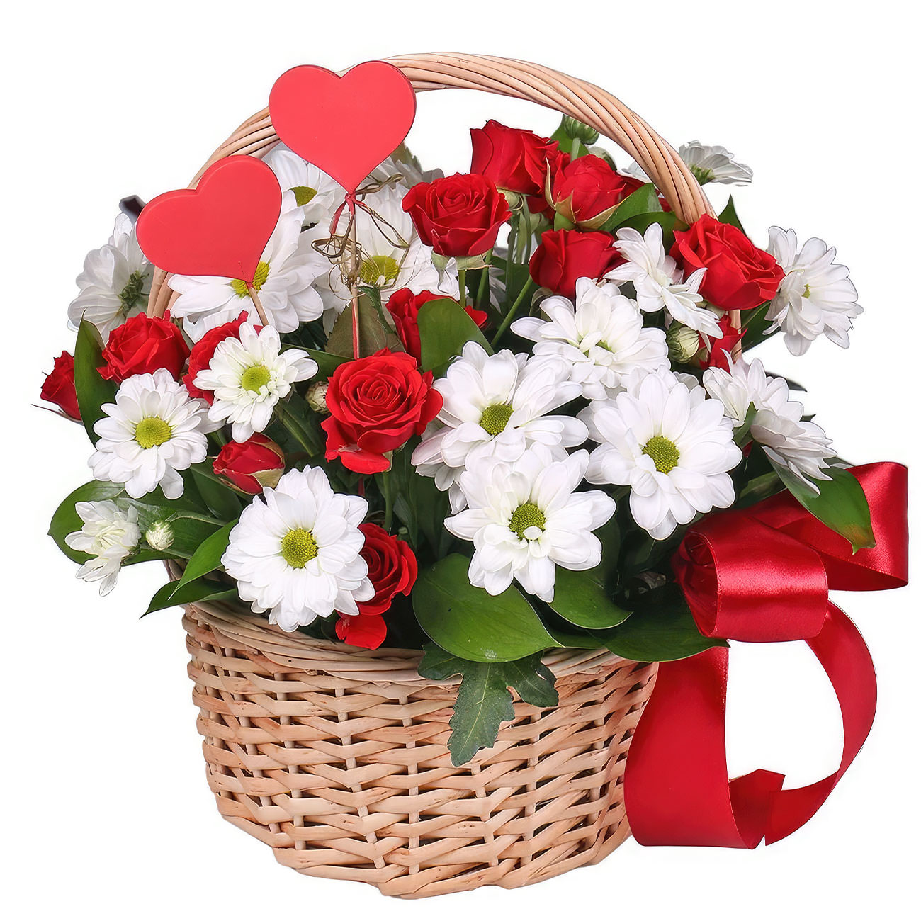 Эта изысканная композиция сочетает в себе белоснежные кустовые хризантемы и яркие красные розы, создавая атмосферу зимней свежести и тепла. Плетёная корзина с красной лентой добавляет элегантности и завершает образ. Возможны альтернативы оформления: корзина из лозы или с тканевой отделкой. Прекрасный подарок для любимой на День святого Валентина или годовщину.