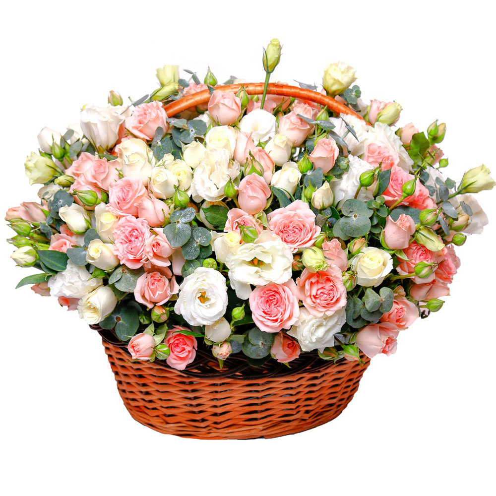 Розовая кустовая роза, белая эустома и эвкалипт создают нежную и изысканную композицию. Корзина из ротанга придаёт естественность и элегантность. Возможны альтернативы оформления: корзина с тканевой отделкой или плетёная корзина. Прекрасный подарок для любимой на годовщину или день рождения.