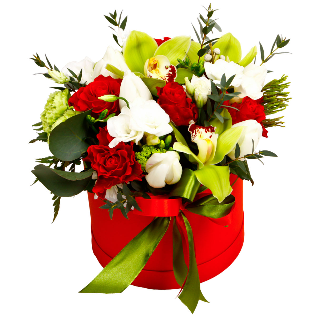 Яркие желтые орхидеи, белоснежные тюльпаны и фрезии, зеленые гвоздики и красные розы создают неповторимую композицию. Шляпная коробка насыщенного красного цвета с зеленой атласной лентой подчеркивает изысканность букета. Альтернативные варианты оформления: бархатная коробка или коробка с принтом. Прекрасный подарок для любимой на 8 марта.