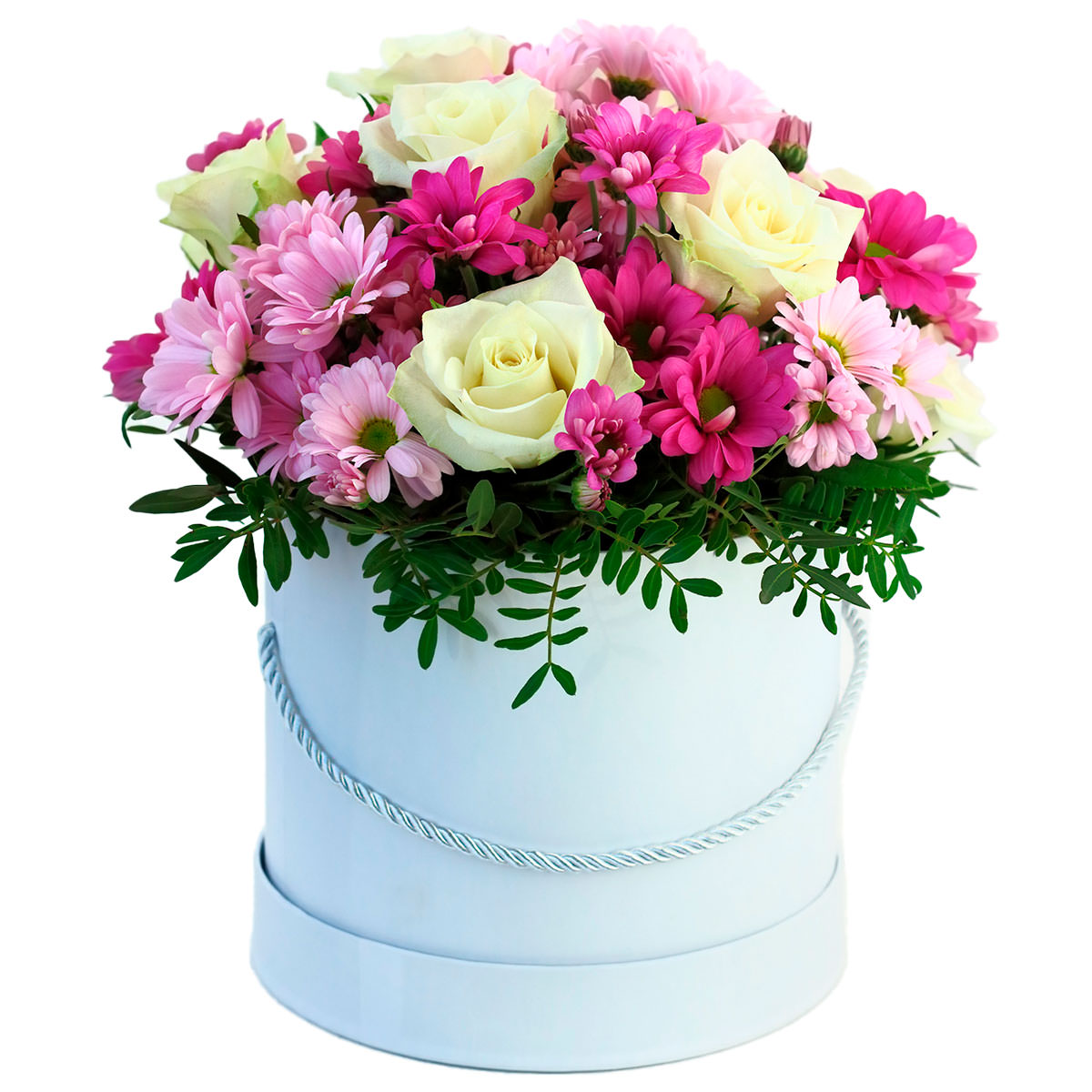 Белые розы и розовые хризантемы создают нежное сочетание, дополненное зеленью. Композиция оформлена в элегантной белой шляпной коробке. Возможны варианты с бархатной или атласной коробкой. Прекрасный подарок для любимой на день рождения.